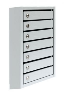 Металлический семисекционный почтовый ящик ПМ-7, предназначен для сбора писем, газет, счетов и личной корреспонденции. Исполнение – вертикальное, поставляется в комплекте с замками. В почтовом ящике установлены фиксаторы дверей для предотвращения несанкционированного вскрытия ячейки. Конструкция ящика позволяет легко производить ремонт или замену двери отдельной секции. Возможно комплектовать задней стенкой (в комплект не входит). Полимерное порошковое покрытие светло-серого цвета (RAL 7035).