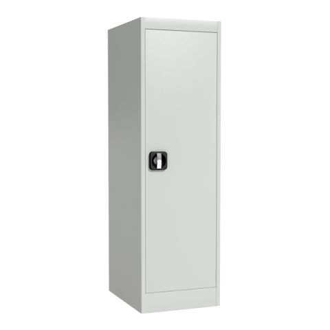 Шкаф разборный односекционный металлический. Имеет регулируемые по высоте полки, дверь шкафа оборудована замком повышенной секретности и ригельной системой запирания. Полимерное порошковое покрытие светло-серого цвета (RAL 7035).